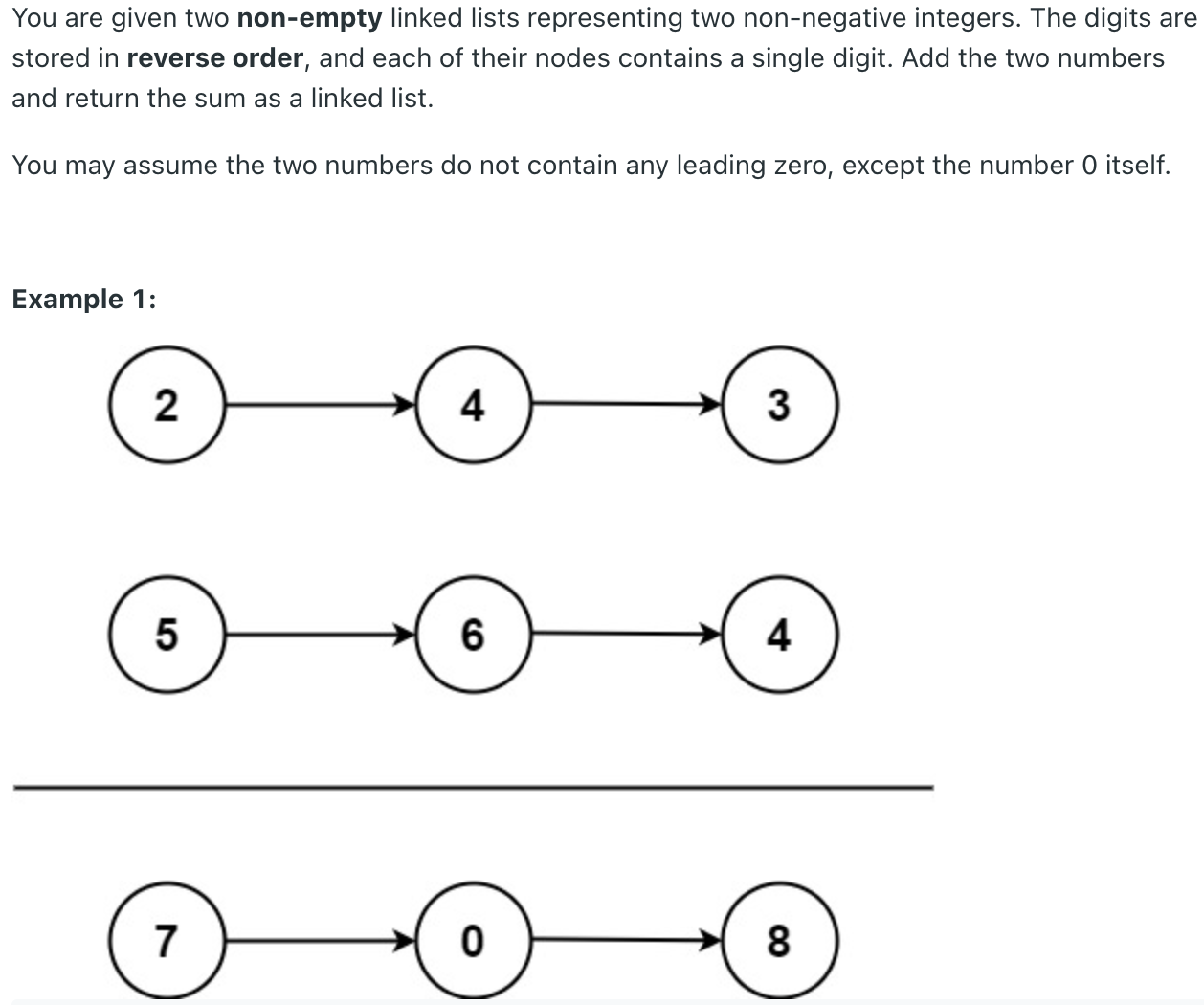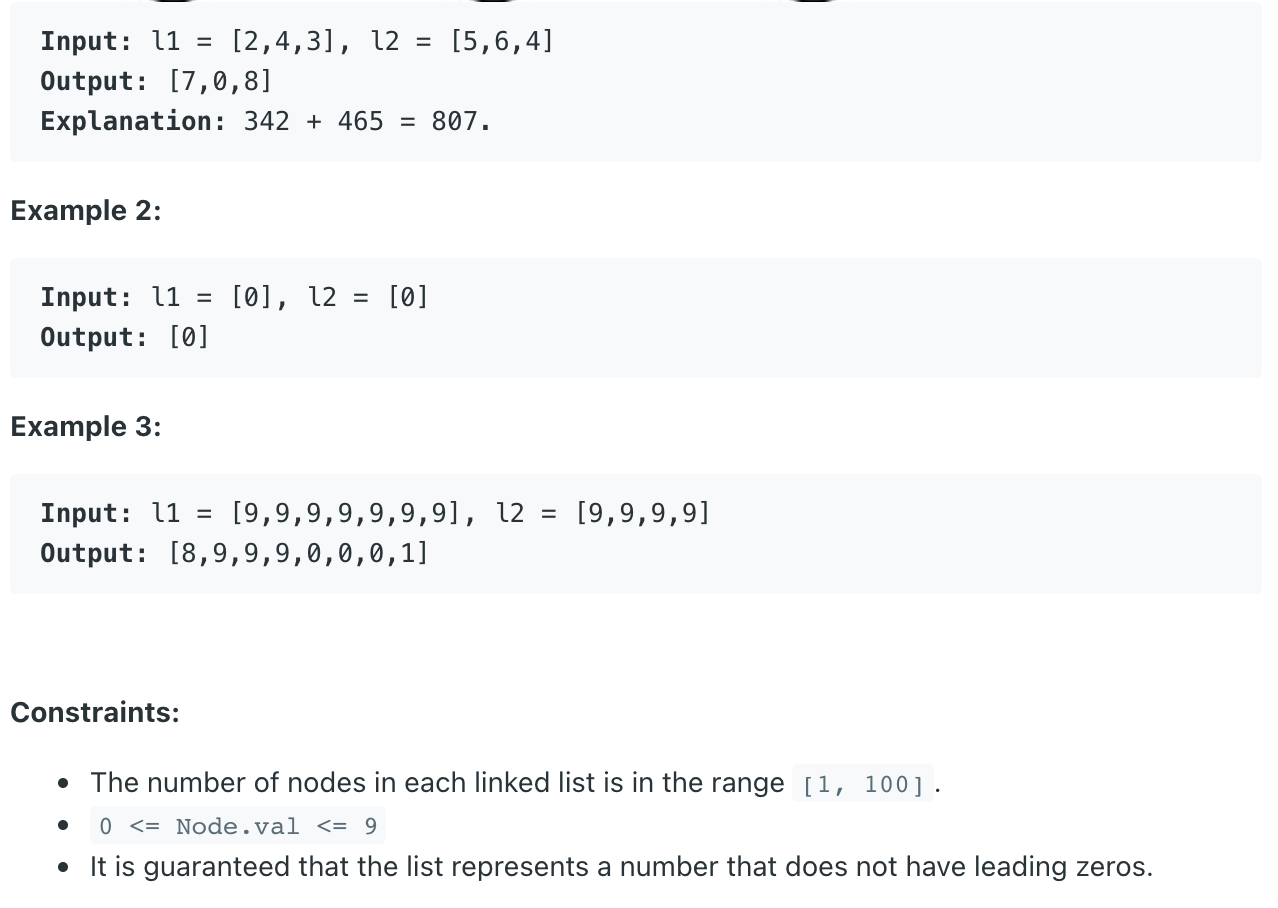 비어있지 않은 두개의 링크드 리스트를 준다. 이 링크드 리스트는 음수가 아닌 정수로 이루어져있고 역순으로 저장돼있다