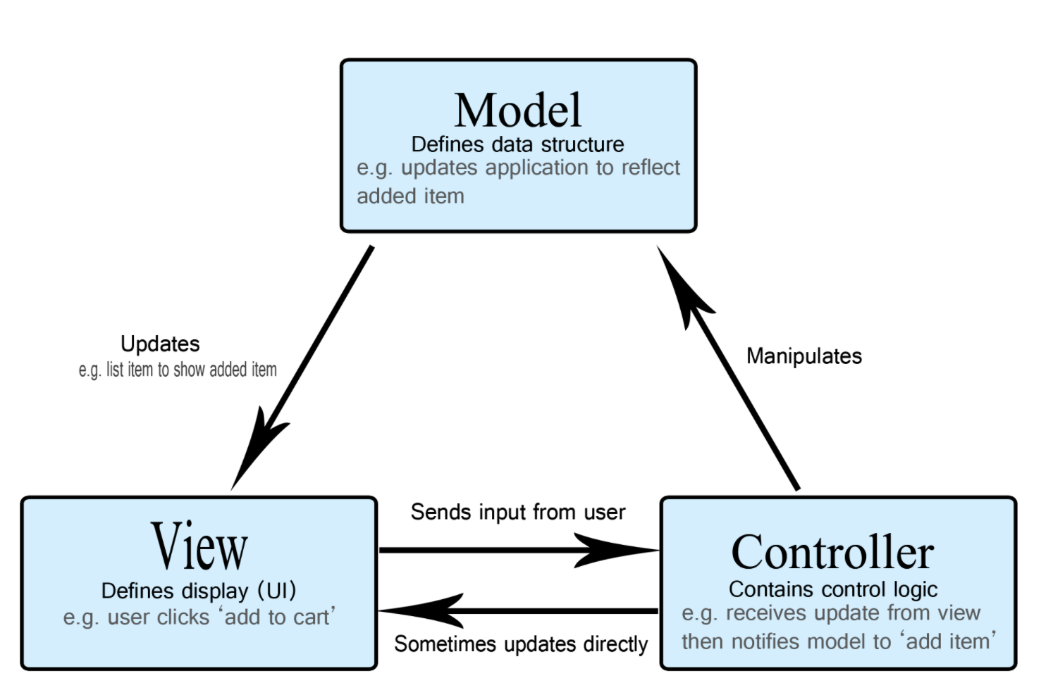 유저는 컨트롤러를 조작하고 컨트롤러는 유저의 조작에 따라서 모델과 뷰를 수정한다