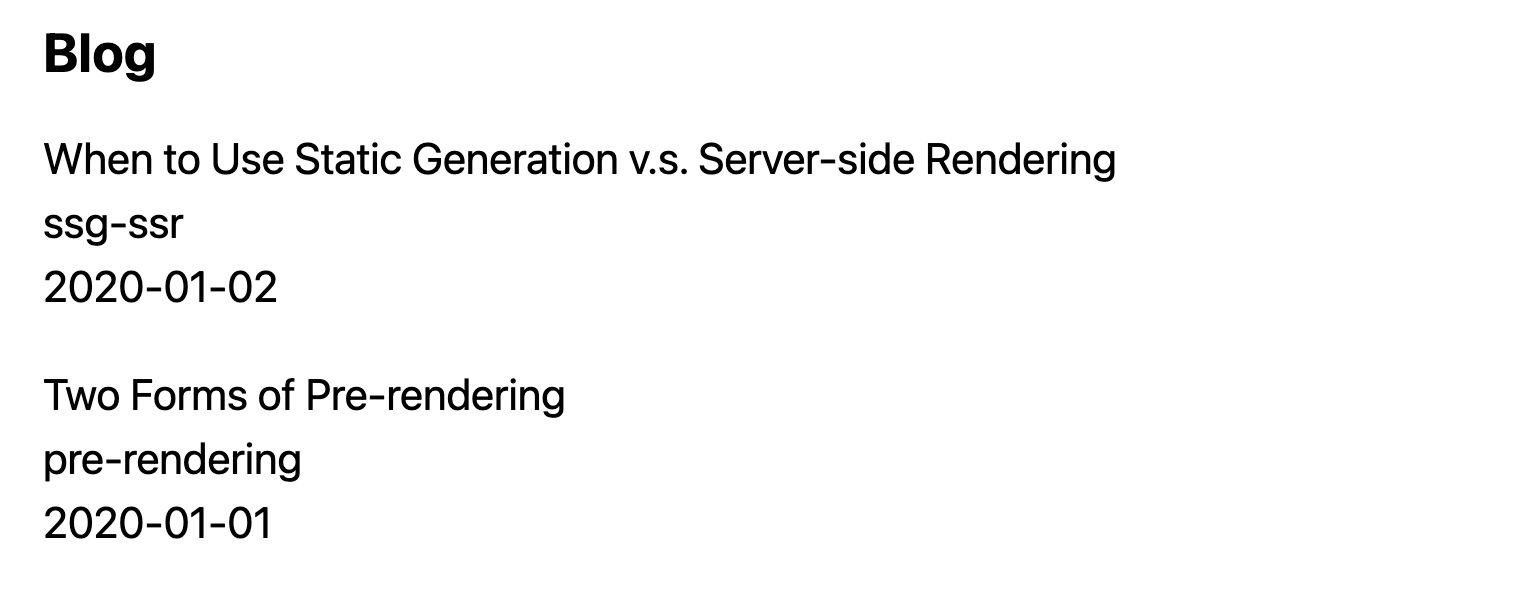 이 마크다운들을 파싱해서 우리의 페이지넣게될 외부 데이터이고 상단에 존재하는 'title'과 'date' 메타데이터는 url로 사용될 것이다