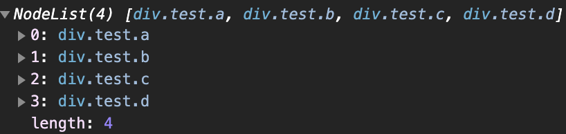 그럼 노드 리스트 형태로 4가지를 다 가져오게되며 배열과 비슷하게 test[index]를 이용해서 각각 요소에 접근할 수 있다