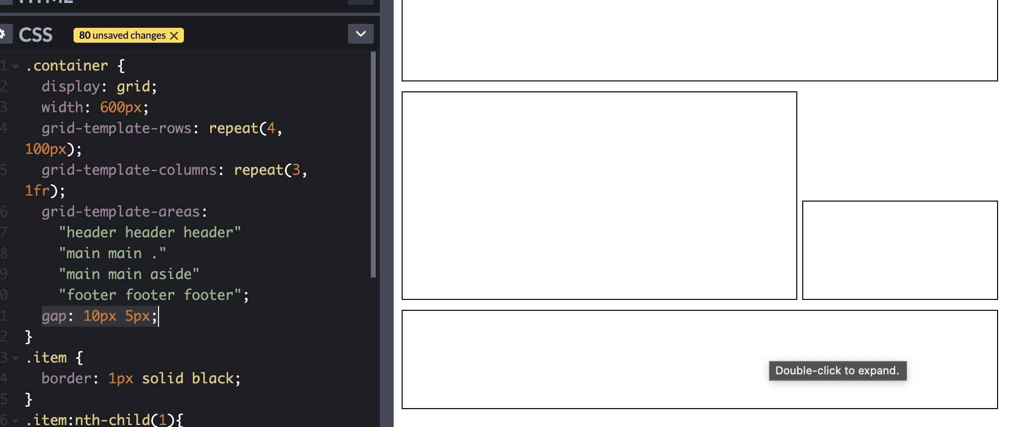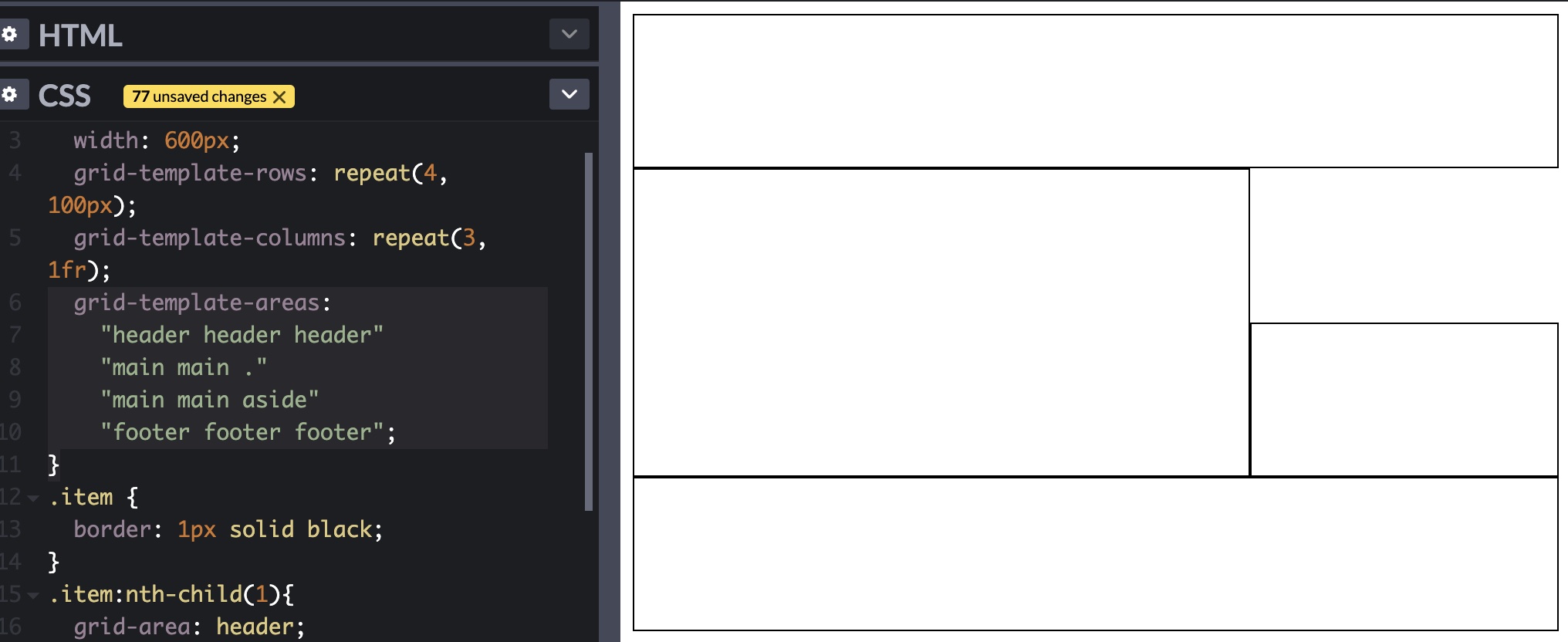 이런식으로 아이템들에게 그리드-영역 이름을 준 뒤에 컨테이너 박스의 grid-template-area 속성에