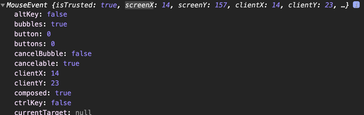 우리가 클릭한 좌표값이 clientX,clientY로 나타난다