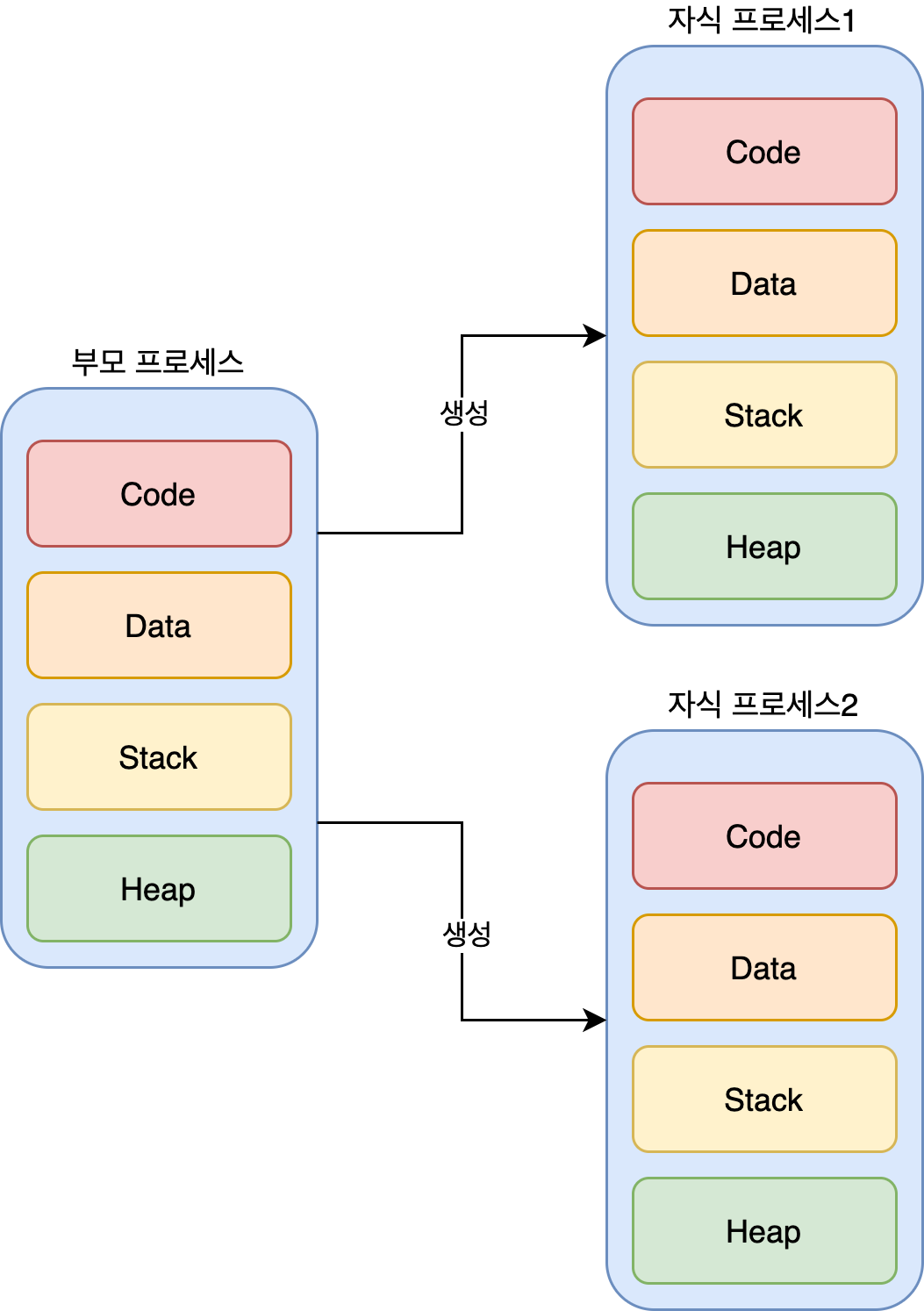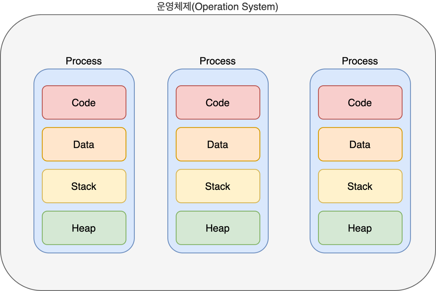 이 과정에서 프로세스는 실행될 때 운영체제로 부터 독립된 메모리 영역을 부여 받게 되고 스레드들은 그 프로세스 내부에서 주소 공간이나 자원들을 공유한다