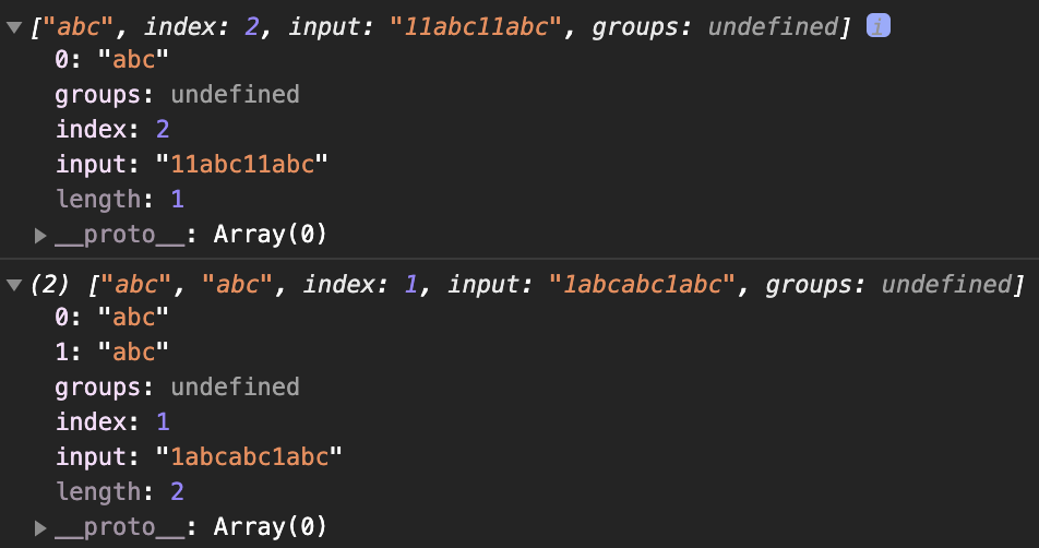 일치하는 패턴이 없을 경우에는 null이 반환되고 그렇지 않은 경우 보는 바와 같이 Array가 반환된다
