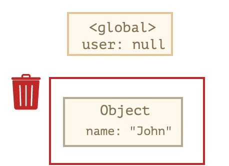 {name : "John"} 객체를 유일하게 참조하고 있던 user의 연결이 끊어져 더 이상 도달 가능한 값이 아니기 때문에 가비지 컬렉터가 이를 수집해간다