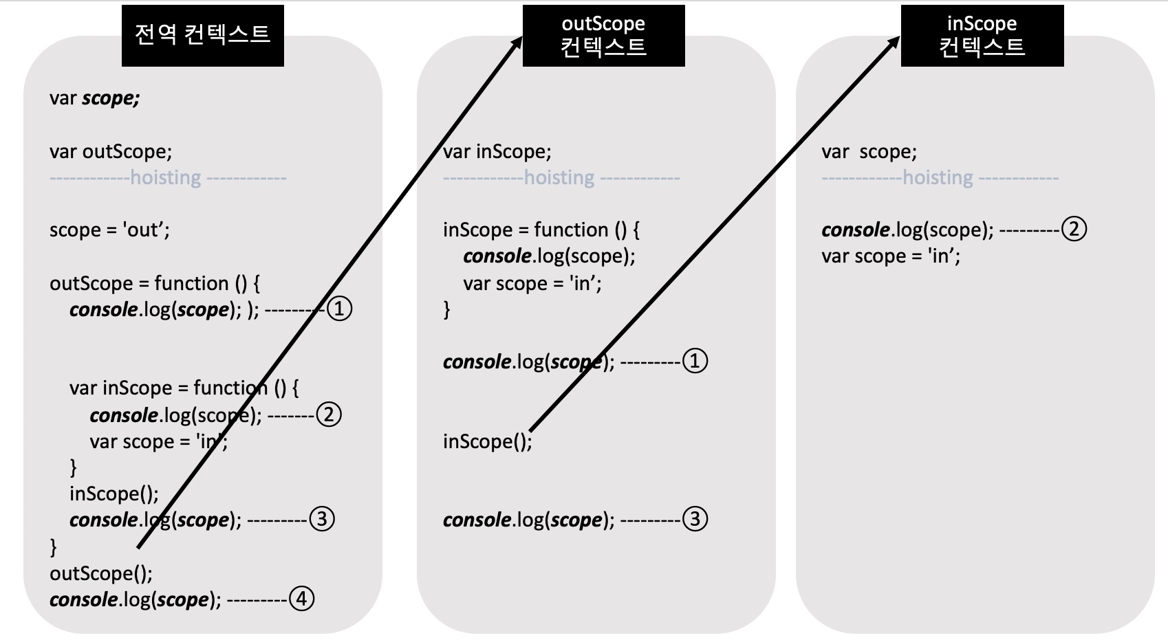 ③번 코드도 ①번 코드와 같은 실행과정을 거쳐 전역 컨텍스트의 scope를 참조해 out을 출력하고