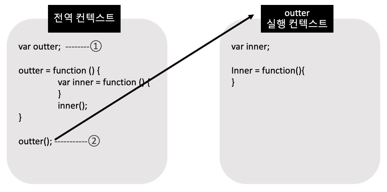 함수를 초기화하고 실행 가능한 코드인 2번을 만나게 되어서 outter의 새 실행 컨텍스트가 실행된다