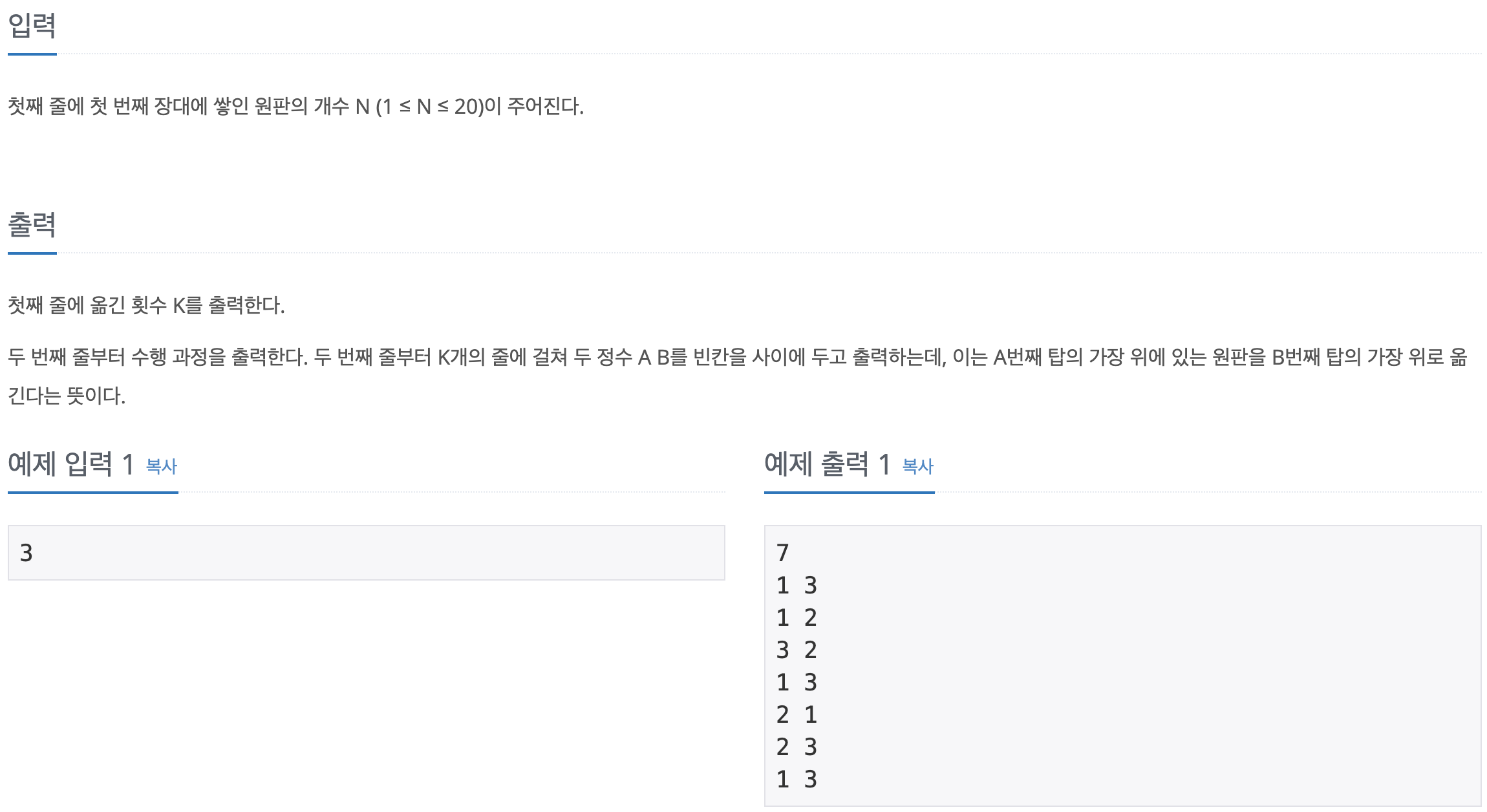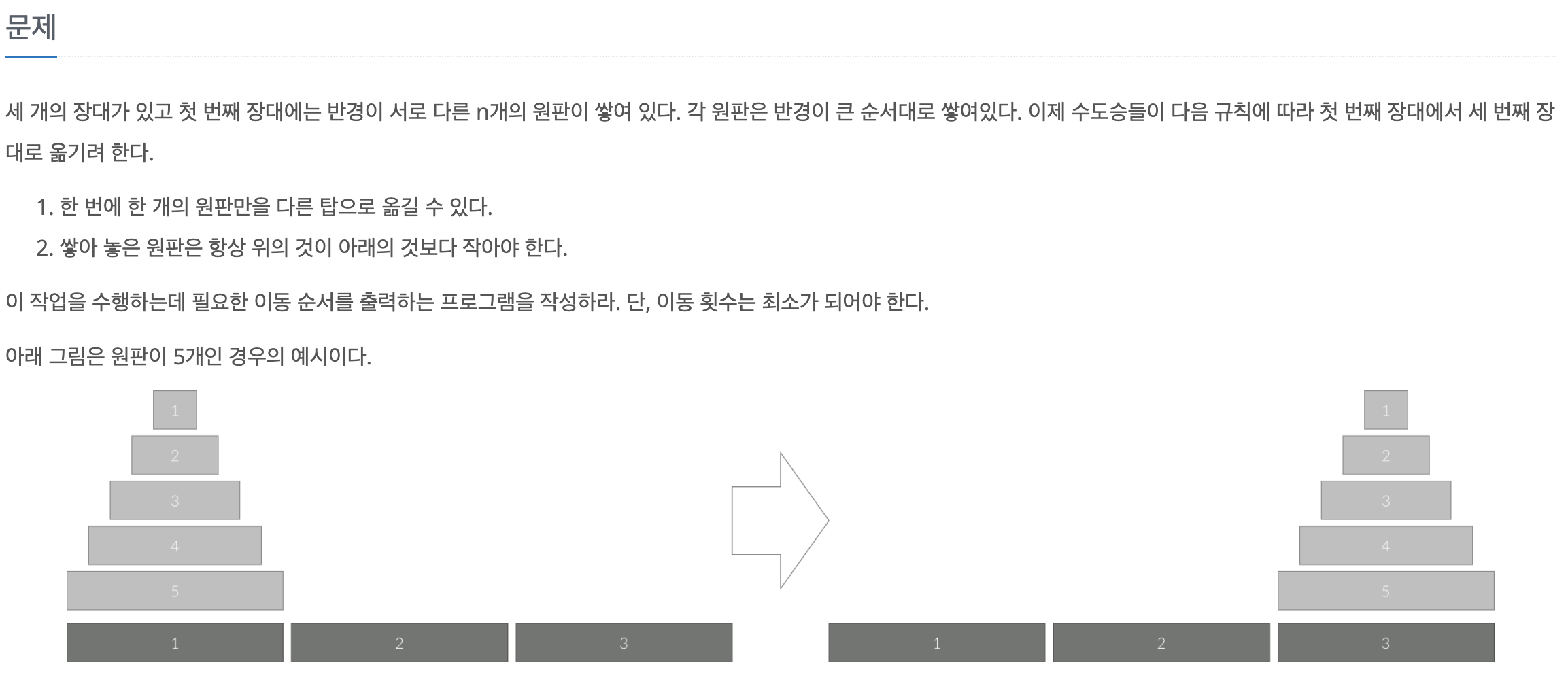 2번에 있는 원판 중 제일 큰 원판을 뺀 n-1만큼 1번으로 옮긴 뒤 제일 큰 원판을 3번으로 이동 시키는 것을 재귀적으로 구현하면 된다