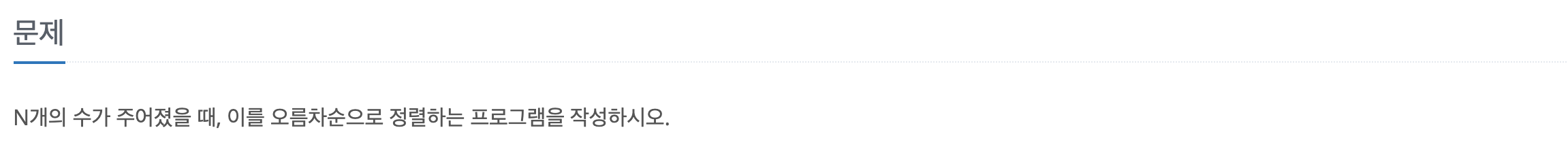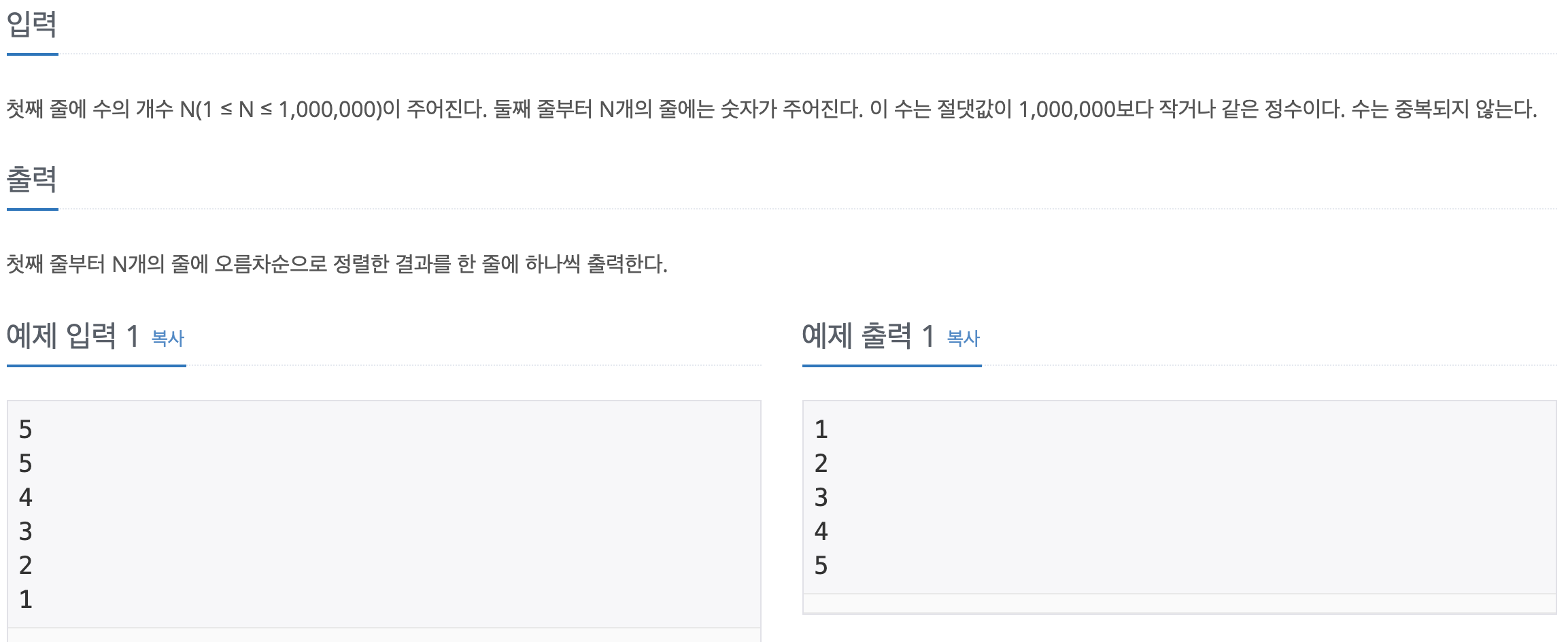 수 정렬하기 1번 문제와 톳씨하나 틀리지않고 동일한 문제 처럼 보이지만 시간 복잡도가 n^2보다 작아야한다