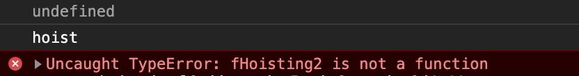 선언과 할당이 동시에 이루어지는 함수 선언식인 fHoisting1은 통째로 호이스팅 되어 코드 최상단으로 올라가 에러가 없이 hoist라는 문자열이 출력되었지만